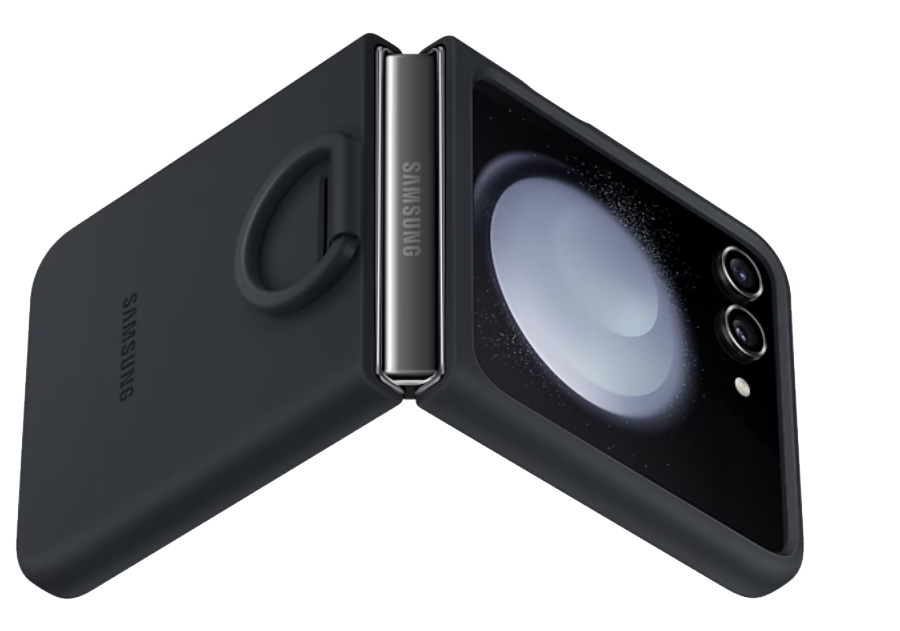 Cinq Galaxy Z Flip5 dans leur étui en silicone de différentes couleurs avec anneau. Ils sont présentés sous différents angles et de plus en plus ouverts.